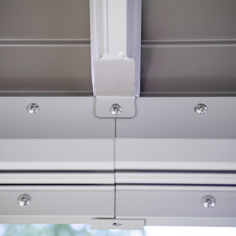 Le choix de ces matériaux de qualité, leur durabilité et la visserie en acier inoxydable justifient la garantie de 5 ans contre la corrosion accordée par le spécialiste canadien Sojag. La hauteur faîtière du pavillon est de 296cm, et deux crochets de fixation multi usages sont présents sur la barre faîtière. Grâce à son excellente stabilité structurelle, ce pavillon est conçu pour faire face à une charge de neige de 150 kg/m².