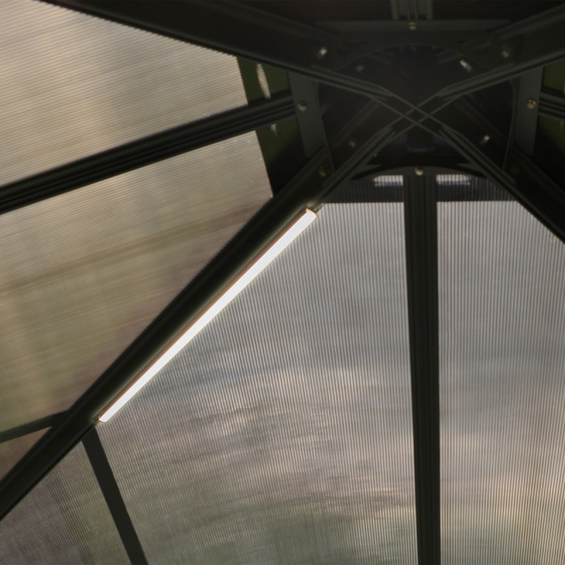 • Grâce à l’éclairage LED intégré, profitez de votre tonnelle en soirée pour une consommation électrique très économe, avec un éclairage blanc à 4000K d’un rendement de 2000 Lumen