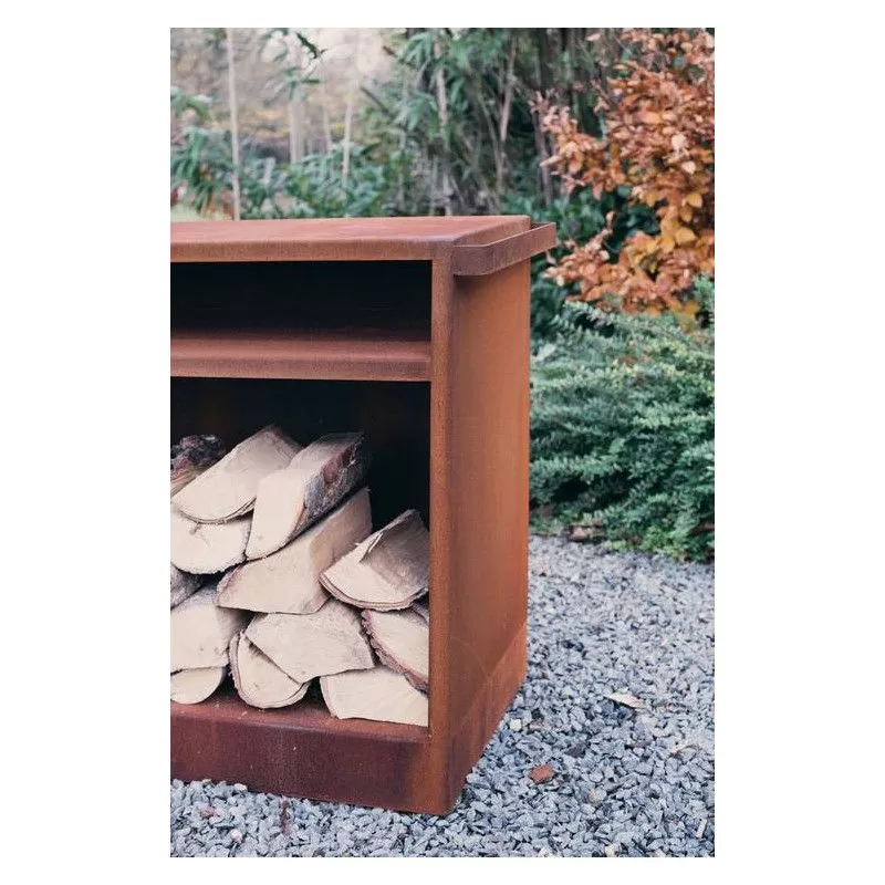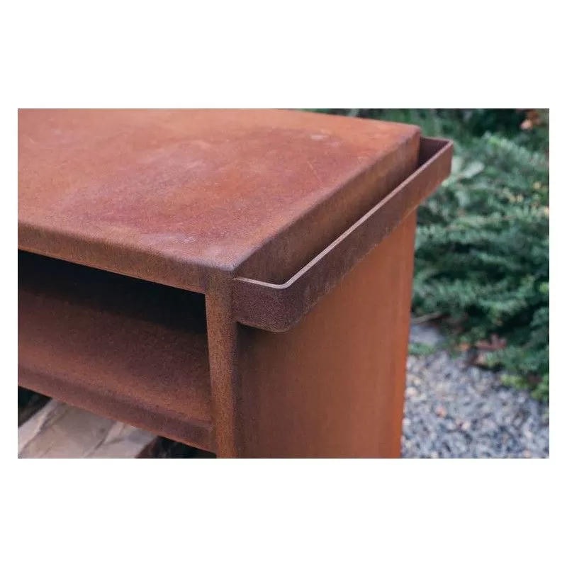 Il est grand, il est très tendance, il offre un grand espace pour ranger des bûches, ce meuble de jardin est pensé pour accueillir les planchas Outr. Mais, il pourra aussi parfaitement convenir à tout ceux qui cherchent un plan de travail pour cuisiner au jardin.